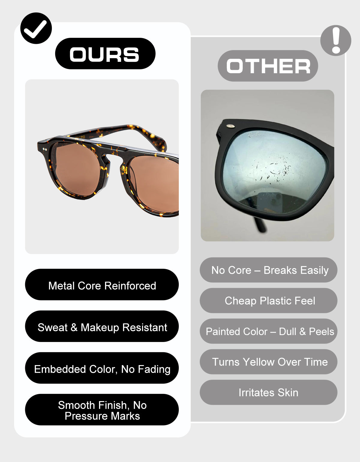A: We get it — most sunglasses don’t last beyond a season. We wanted to fix that. Our frames are built with quality materials, designed with taste, and priced with fairness. No compromises — just good sunglasses that look and feel great.